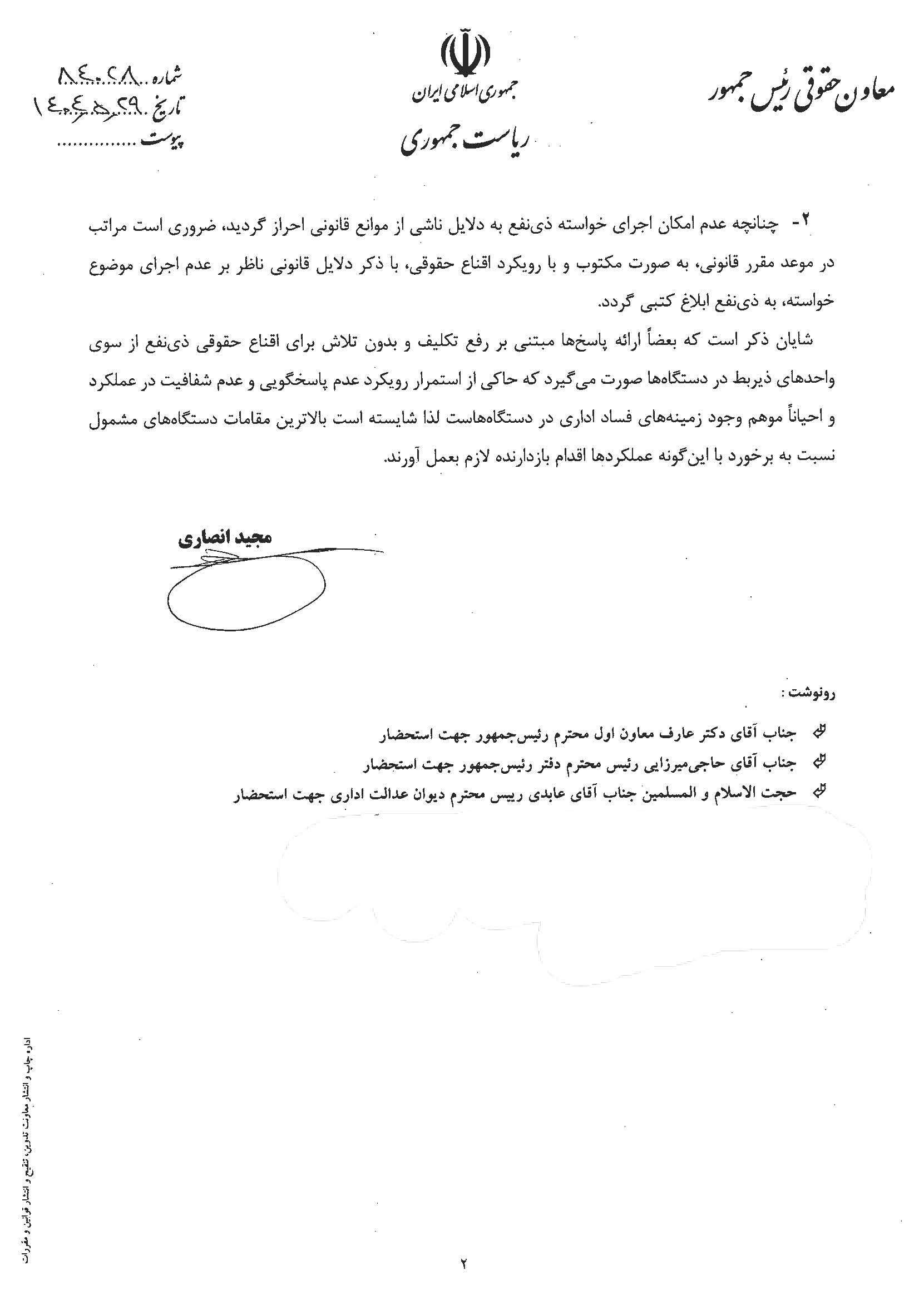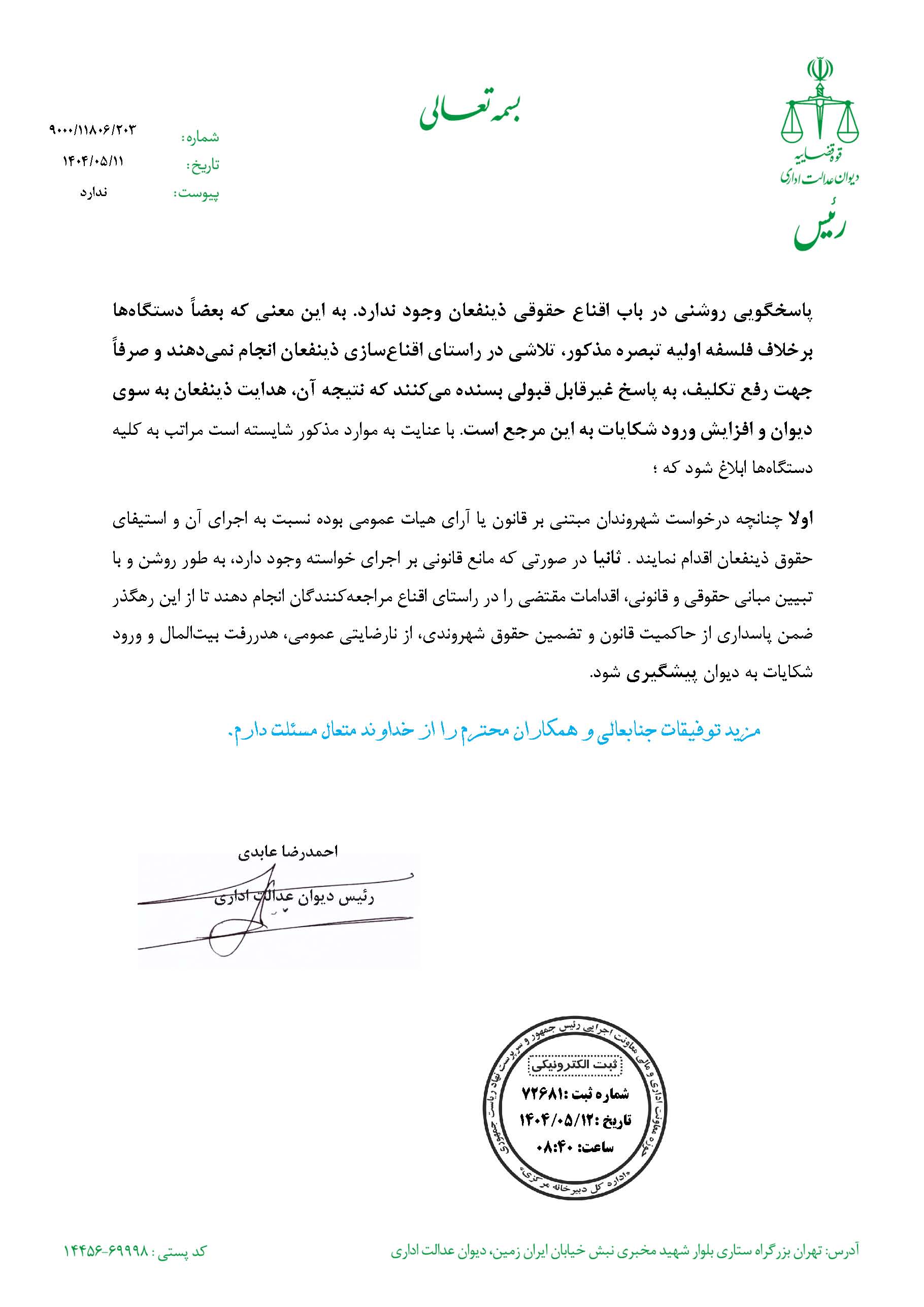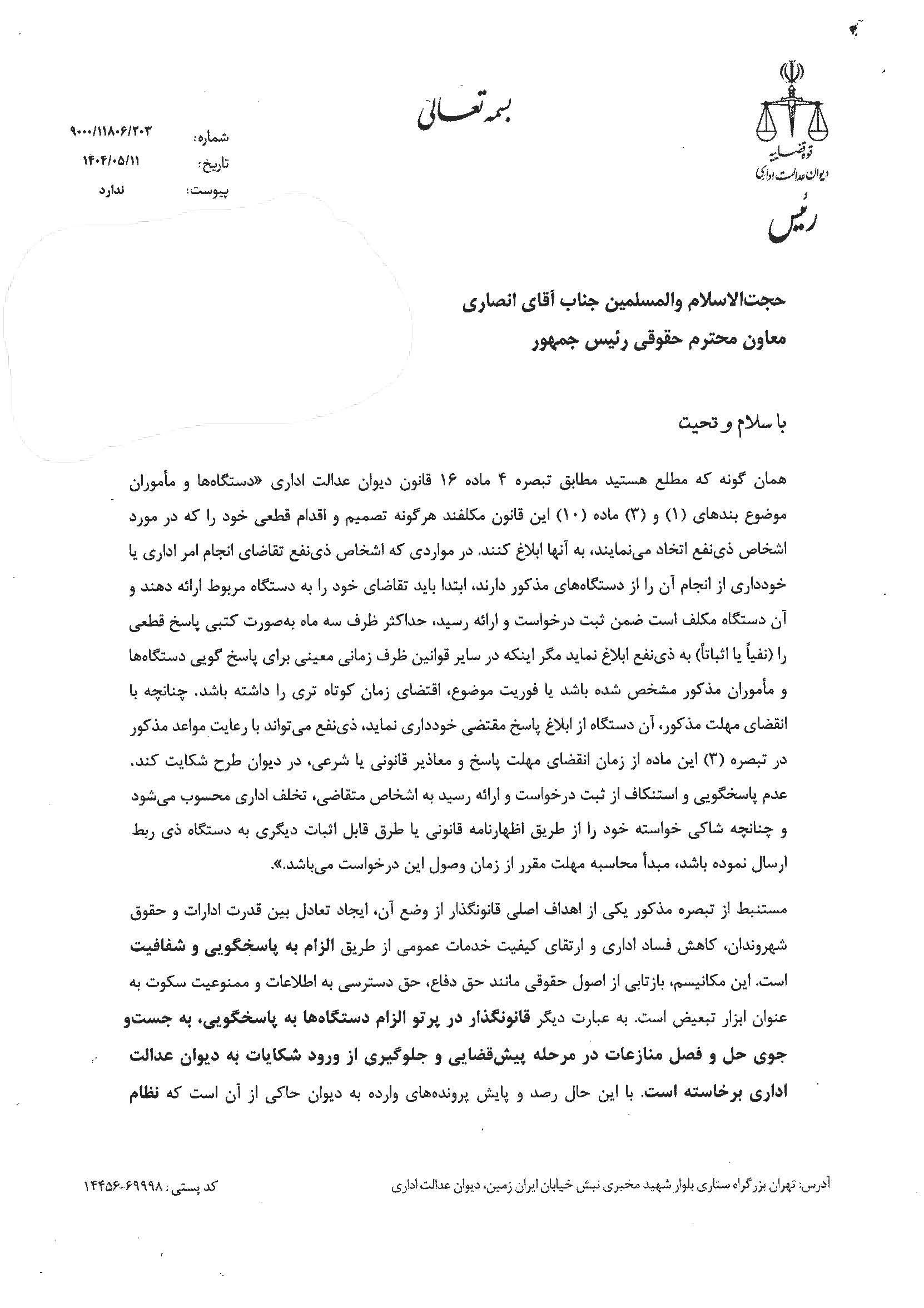 بنابر اعلام اتاق ایران، تصویر نامه رئیس دیوان عدالت اداری و نامه مدیر امور حقوقی و معاون امور حقوقی رئیس جمهور با موضوع پاسخگویی به مراجعین و اقناع قانونی ایشان در پیوست های زیر در دسترس است.