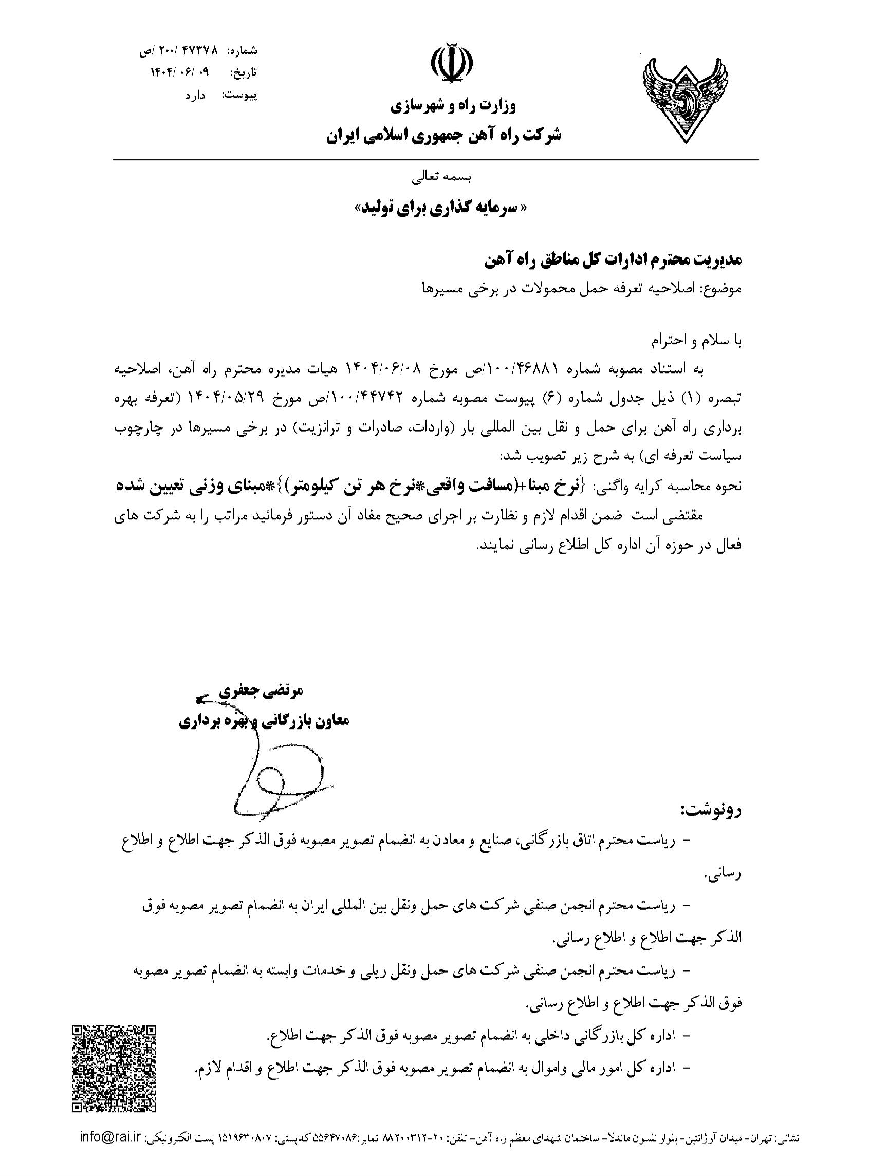 بنابر اعلام شرکت راه آهن جمهوری اسلامی ایران، تعرفه بهره برداری راه آهن برای حمل و نقل بین المللی بار (واردات، صادرات و ترانزیت) در برخی مسیرها در چارچوب سیاست تعرفه ای اصلاح شد. جزئیات بیشتر این اطلاعیه در زیر قابل مشاهده است.