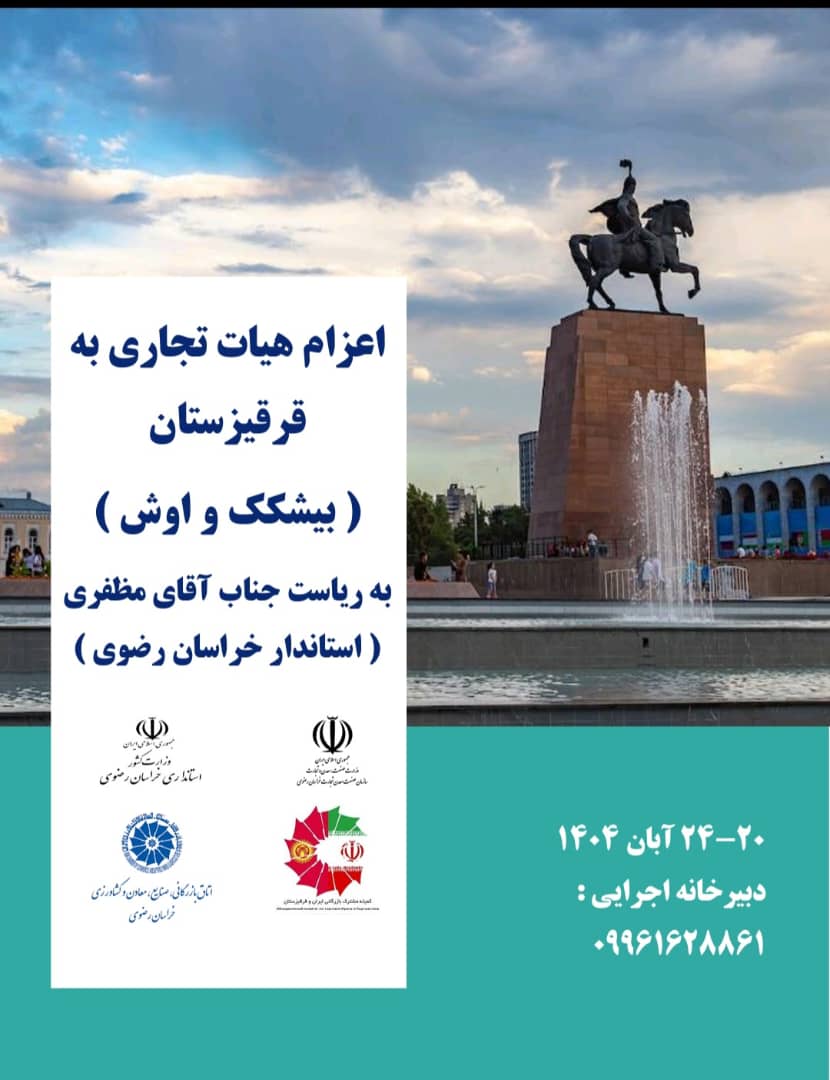 بنابر اعلام اتاق ایران، کمیته مشترک بازرگانی ایران و قرقیزستان در نظر دارد همزمان با برگزاری نمایشگاه بین المللی اکسپو بیشکک (20 الی 24 آبان ماه 1404) هیأتی تجاری به سرپرستی استاندار خراسان رضوی به کشور قرقیزستان (اوش و بیشکک) اعزام کند. علاقمندان برای کسب اطلاعات بیشتر و ثبت نام در هیات مذکور می توانند با دبیرخانه اجرایی به شماره 09961628861 تماس حاصل فرمایید.