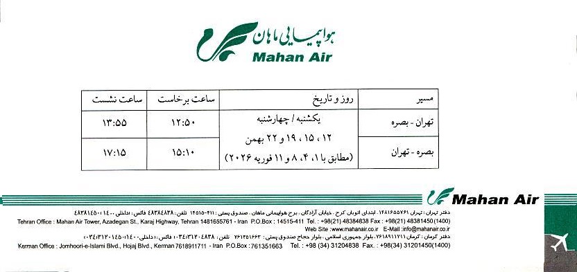 شرکت هواپیمایی ماهان جهت گسترش مسیرهای حمل و نقل هوایی بین ج.ا.ایران و جمهوری عراق در مسیر تهران ـ بصره ـ تهران پروازهایی را به شرح زیر برقرار نموده است.