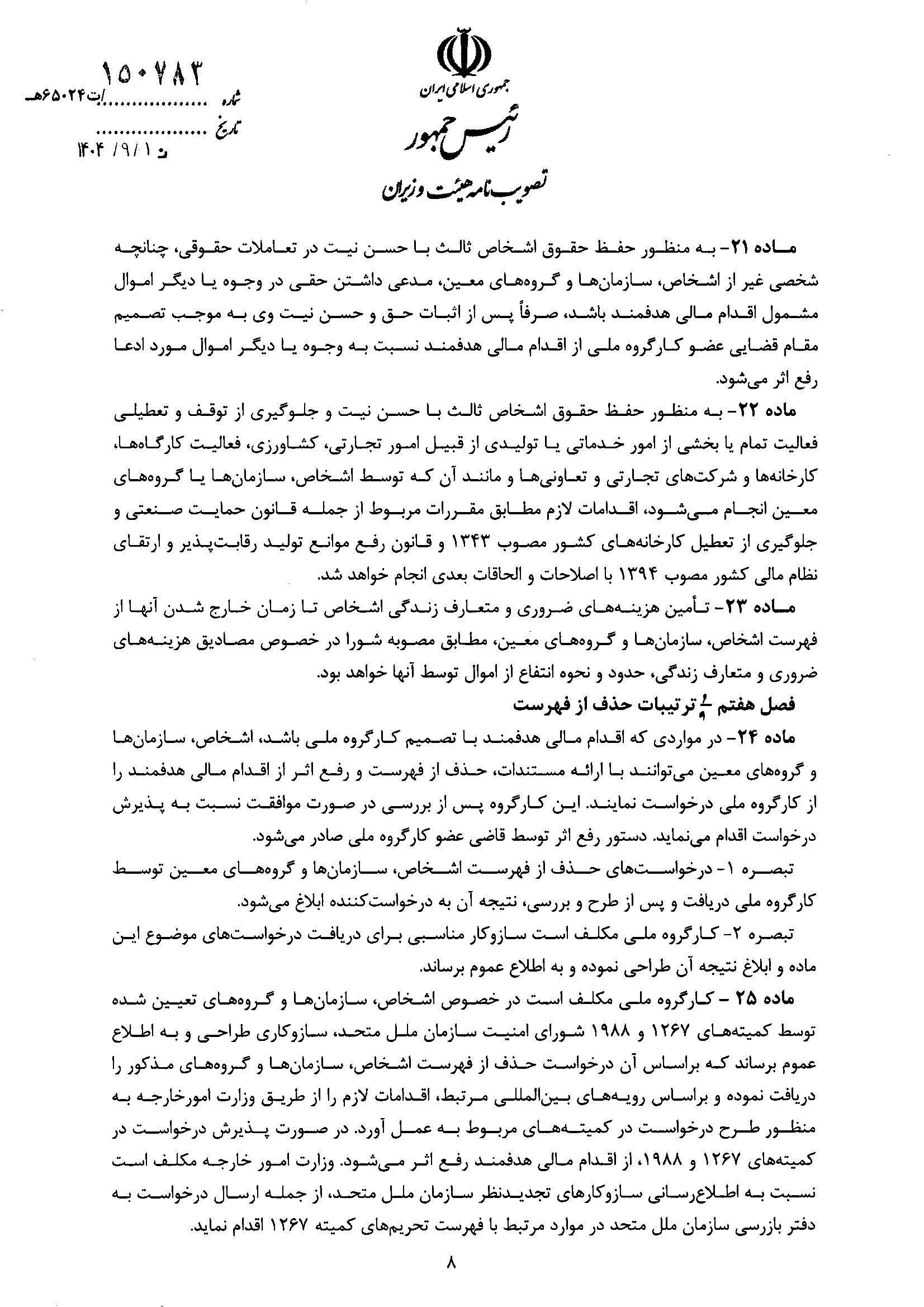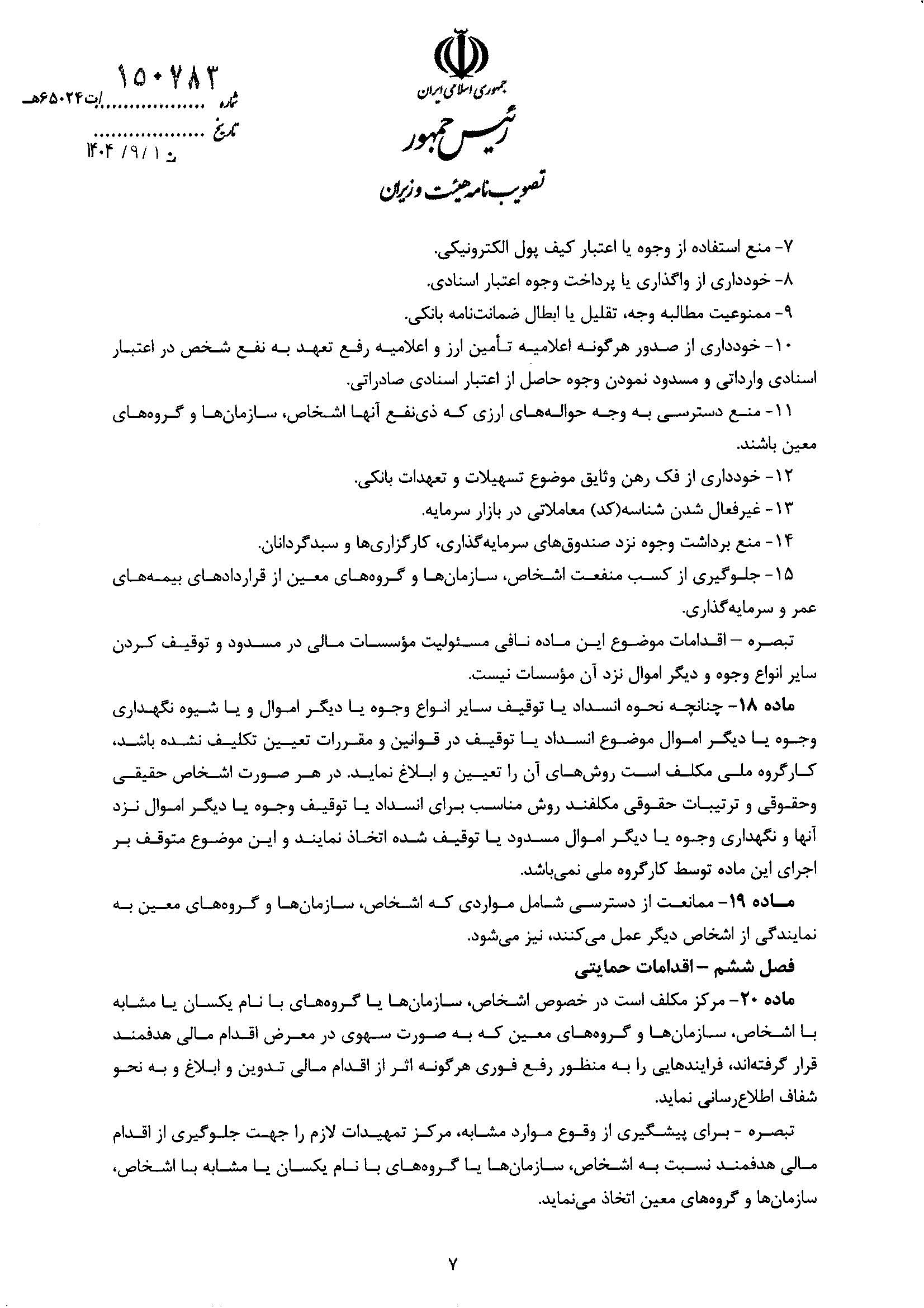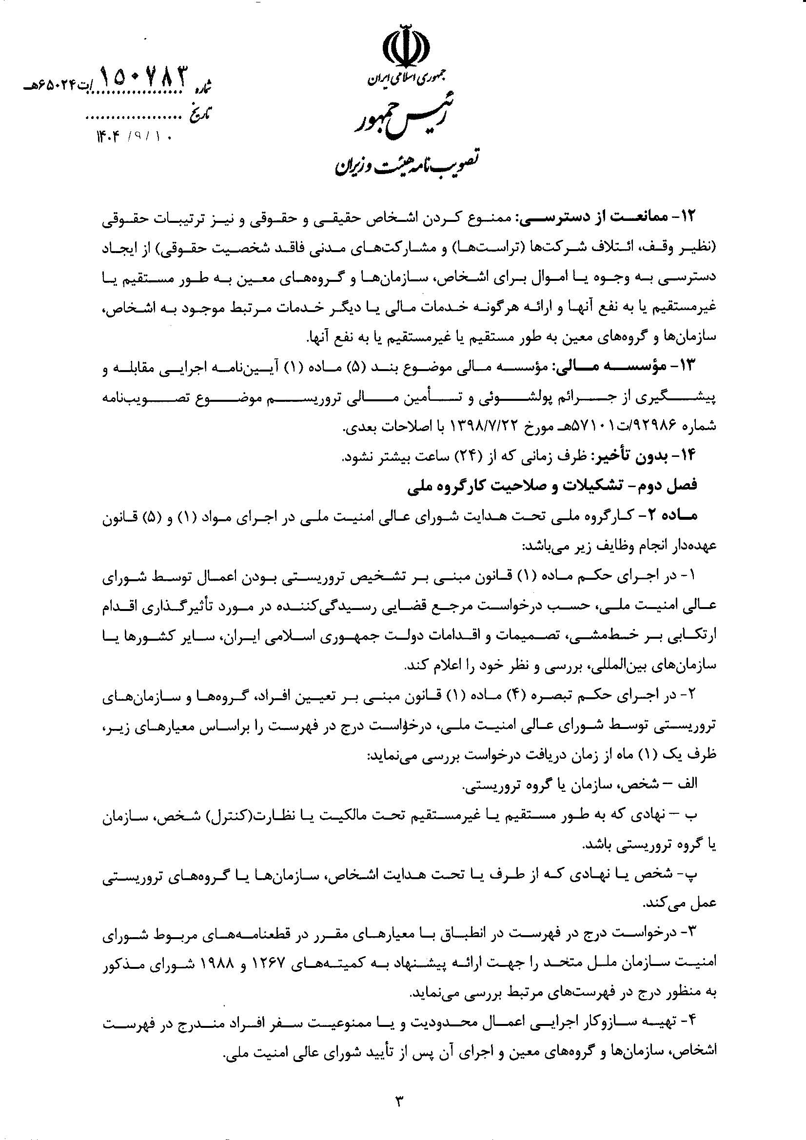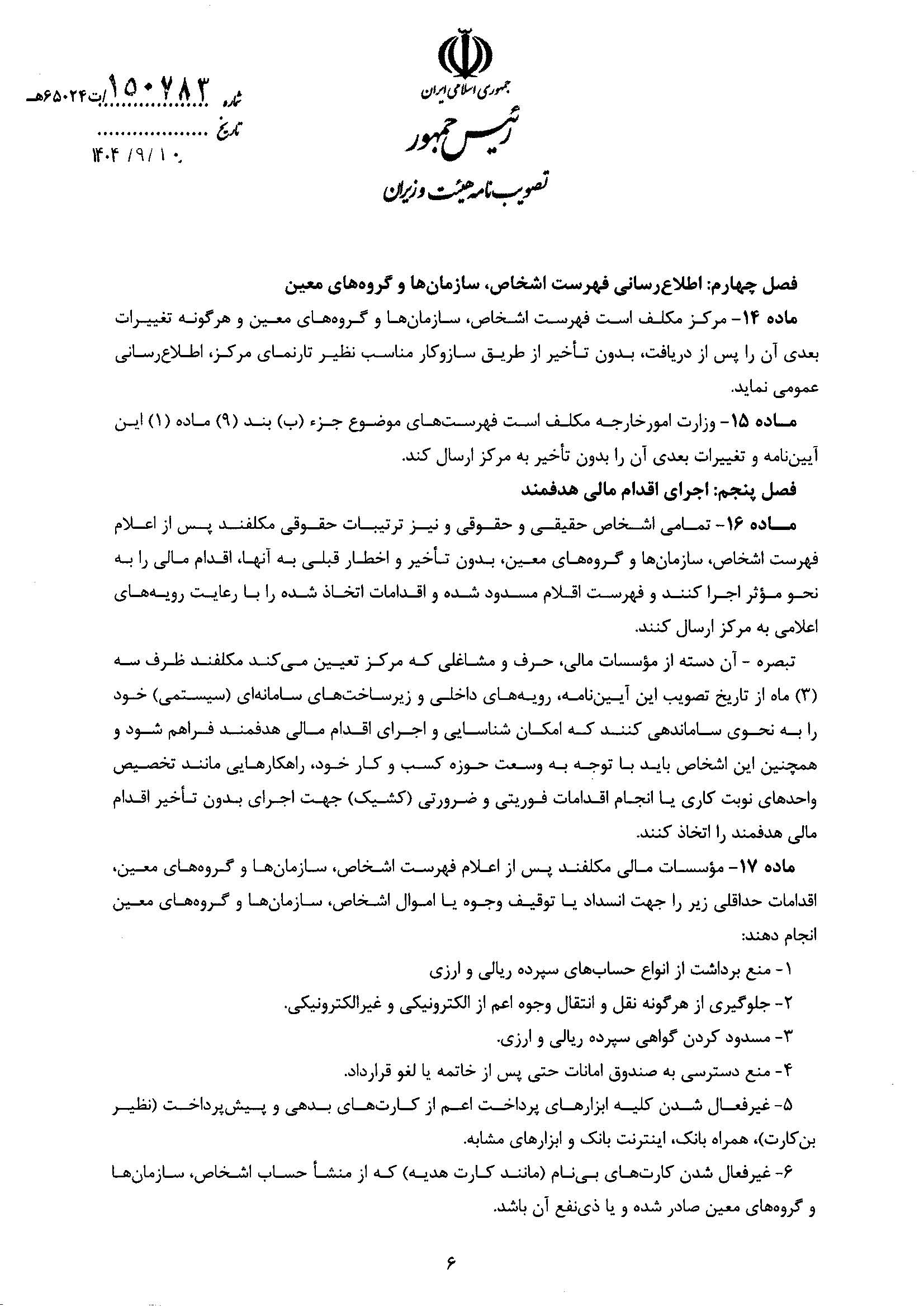 بنابر اعلام اتاق ایران، آیین نامه اجرایی اقدام مالی هدفمند علیه تروریسم و تأمین مالی تروریسم، از سوی هیات وزیران تصویب شد.