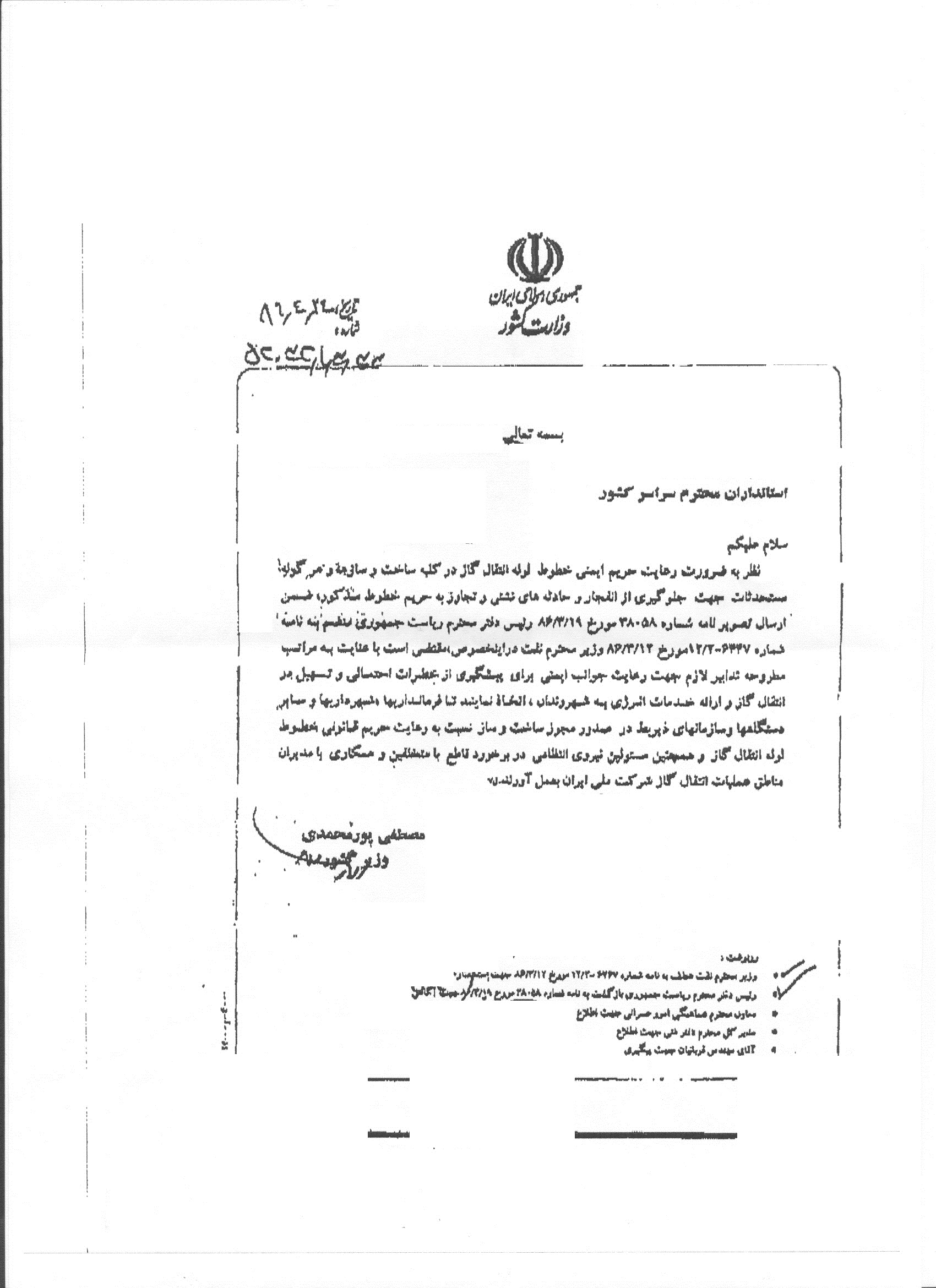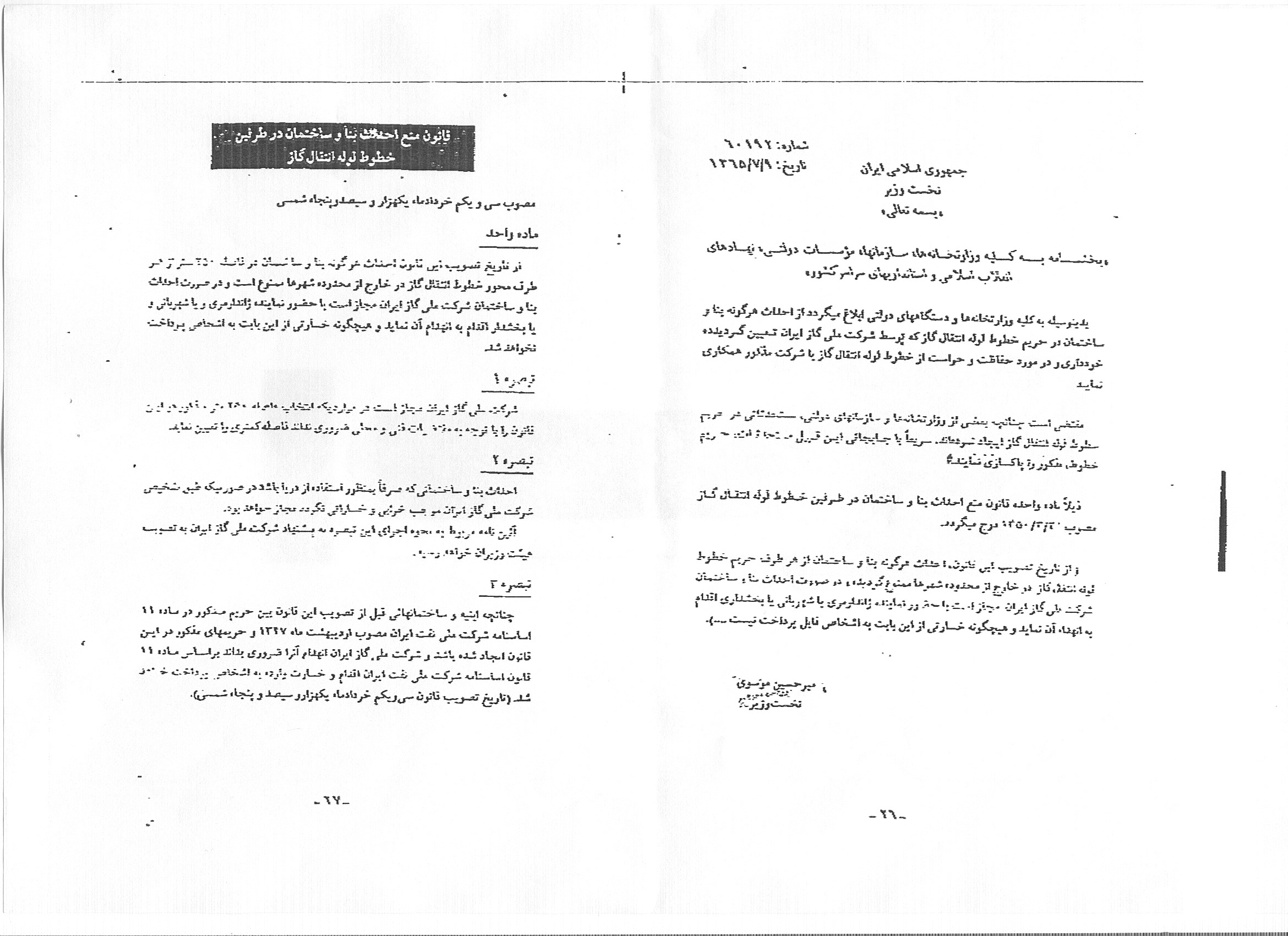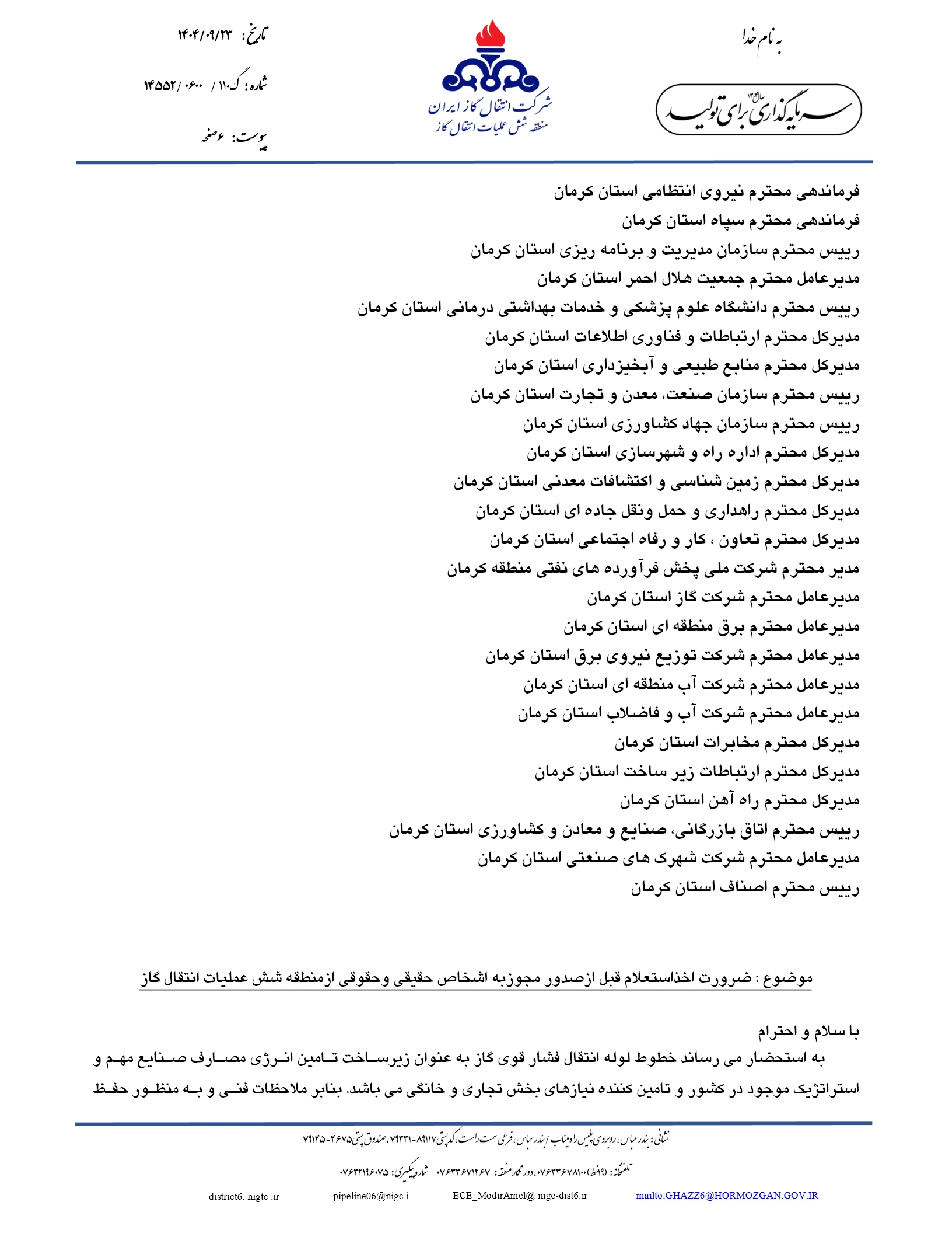 بنابر اعلام شرکت انتقال گاز ایران( منطقه شش عملیات انتقال گاز)، با توجه به ملاحظات فنی و به منظور ایمنی ساکنان و همجواران خطوط انتقال لوله گاز و همچنین زیرساخت های کشور، قانون منع احداث بنا و ساختمان در طرفین خطوط انتقال لوله گاز ممنوع است؛ بنابراین ارائه خدمات و واگذاری انشعابات آب، برق، گاز و… به مستحدثات غیرمجاز در حریم خطوط لوله انتقال گاز ممنوع است و قبل از تصویب هرگونه طرح هادی و پروژه های اجرایی، اخذ استعلام از منطقه شش عملیات انتقال گاز ضروری است.