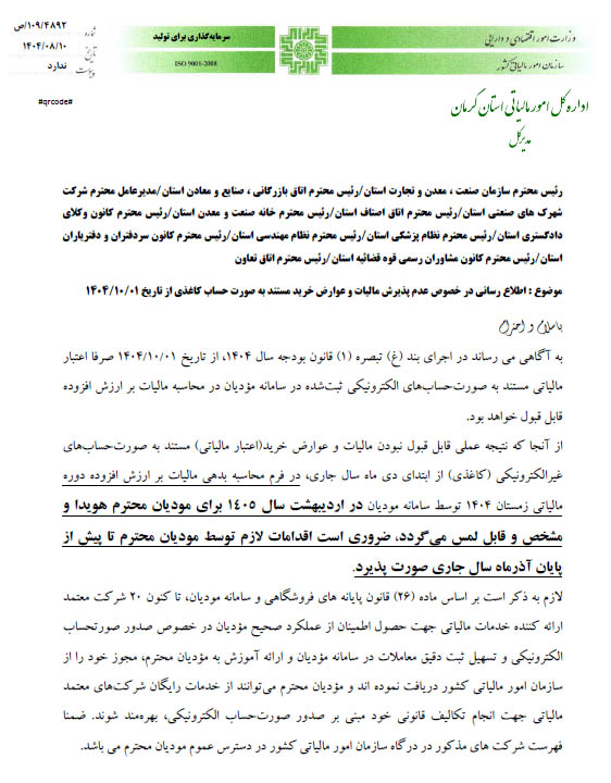 بر اساس اعلام اداره کل مالیاتی استان کرمان، از تاریخ 1404.10.01 صرفا اعتبار مالیاتی مستند به صورت حساب های الکترونیکی در سامانه مودیان در محاسبه مالیات بر ارزش افزوده قابل قبول خواهد بود.