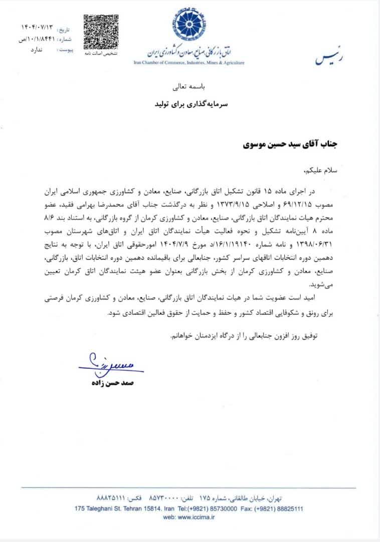 با تایید رئیس اتاق ایران و در اجرای ماده 15 قانون تشکیل اتاق بازرگانی، صنایع، معادن و کشاورزی جمهوری اسلامی ایران و نظر به درگذشت محمدرضا بهرامی عضو فقید هیات نمایندگان اتاق کرمان از گروه بازرگانی، و با توجه به نتایج دهمین دوره انتخابات اتاق های سراسر کشور، “سیدحسین موسوی” به عنوان عضو هیات نمایندگان اتاق کرمان برای باقیمانده دوره دهم معرفی شد.