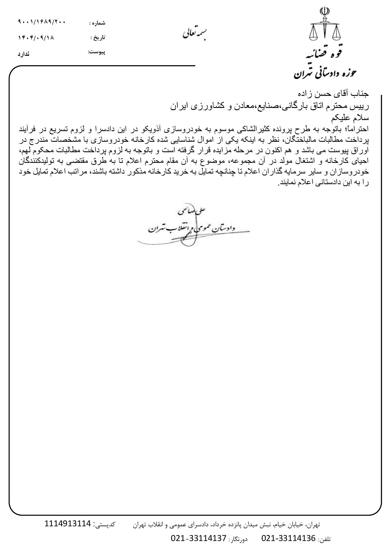 بر اساس اعلام دادستان عمومی و انقلاب تهران، با توجه به طرح پرونده کثیرالشاکی موسوم به کارخانه خودروسازی آذویکو در این دادسرا و لزوم تسریع در فرآیند پرداخت مطالبات مالباختگان، هم اکنون این کارخانه در مرحله مزایده قرار گرفته و چنانچه تولیدکنندگان، خودروسازان و سایر سرمایه گذاران تمایل به خرید کارخانه مذکور را دارند، مراتب را اعلام نمایند.