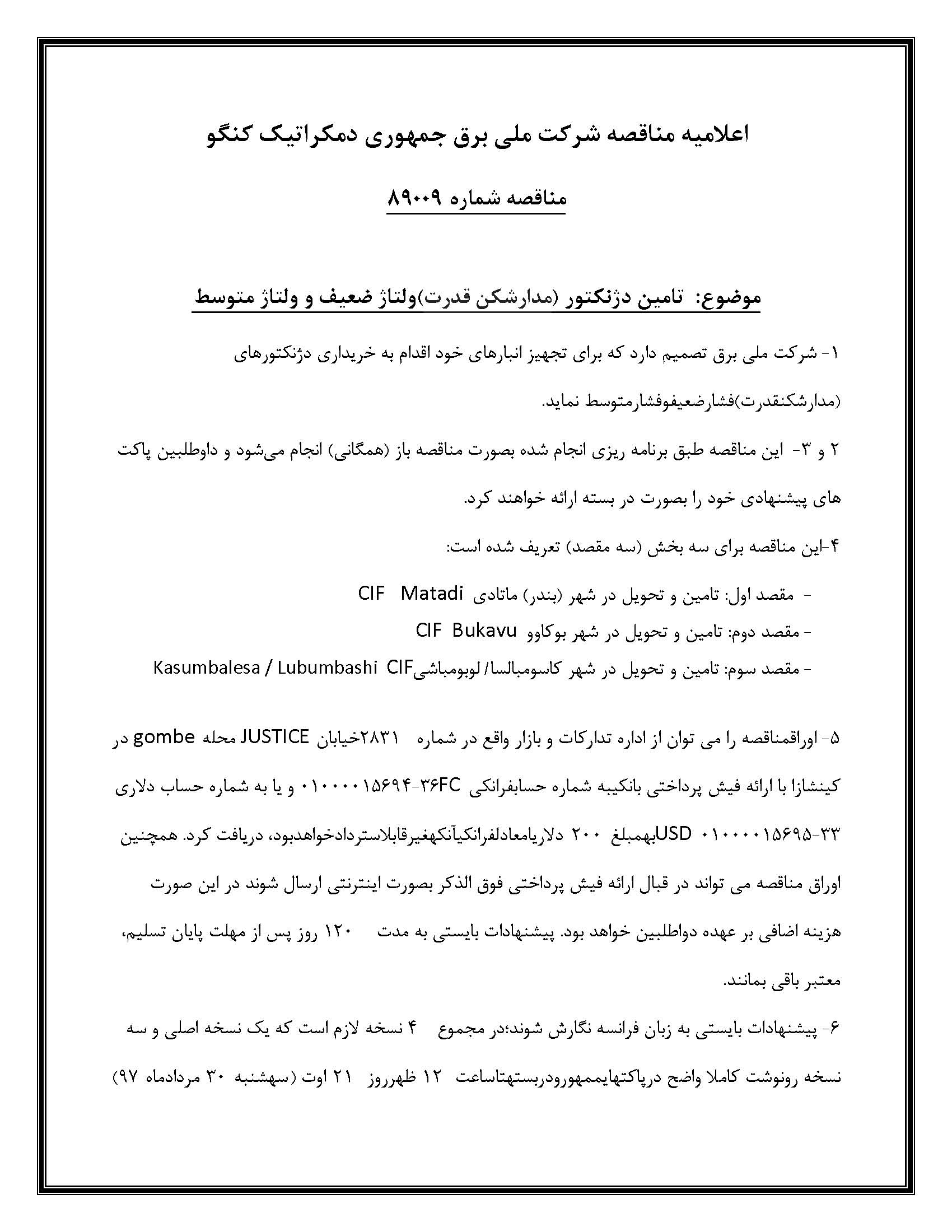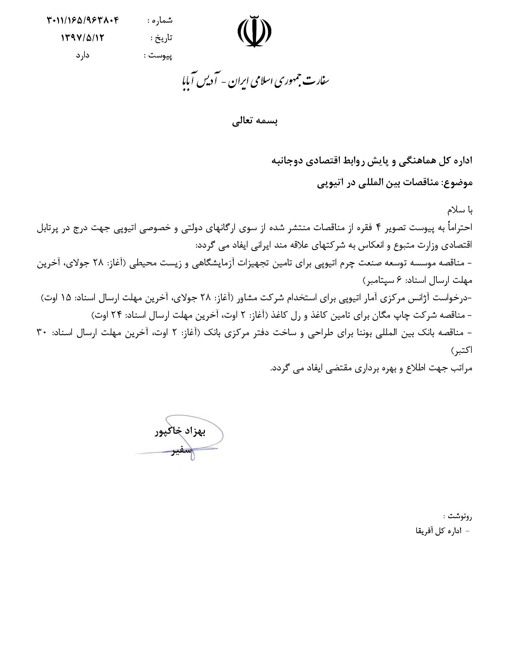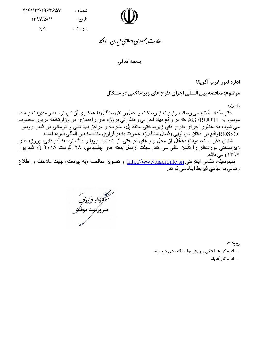 وزارت امورخارجه، مناقصه های بین المللی واصله از نمایندگی کشورمان در کشورهای ترکمنستان، اتیوپی، سنگال و کنگو را برای اطلاع شرکت ها و فعالان اقتصادی اعلام کرد که جزئیات مربوط به این مناقصه ها در زیر آمده است.