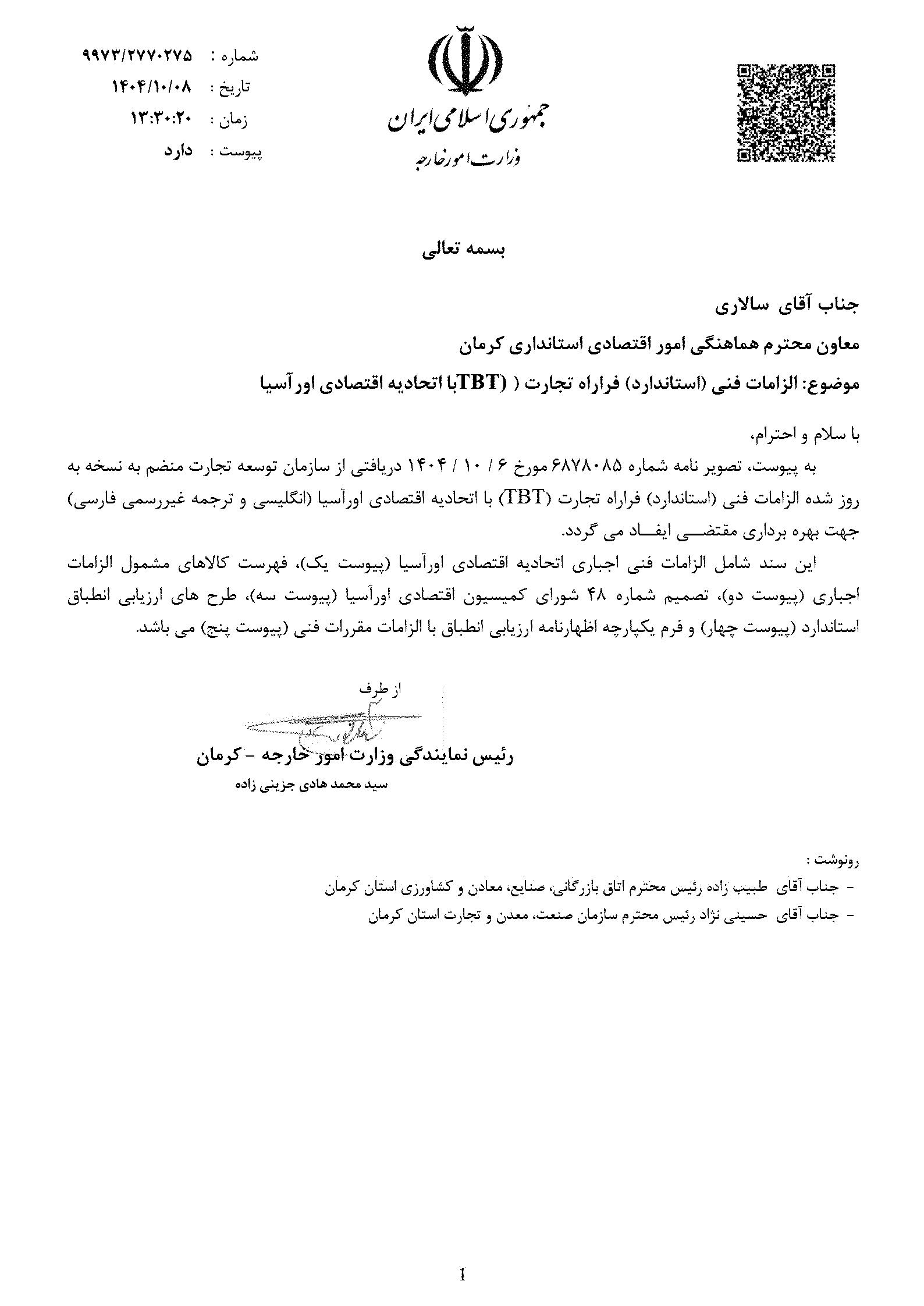 بنابر اعلام وزارت امور خارجه جمهوری اسلامی ایران، نسخه الزامات فنی (استاندارد) فراراه تجارت (TBT) با اتحادیه اقتصادی اوراسیا به روز شده و جزئیات بیشتر آن در زیر قابل مشاهده است.