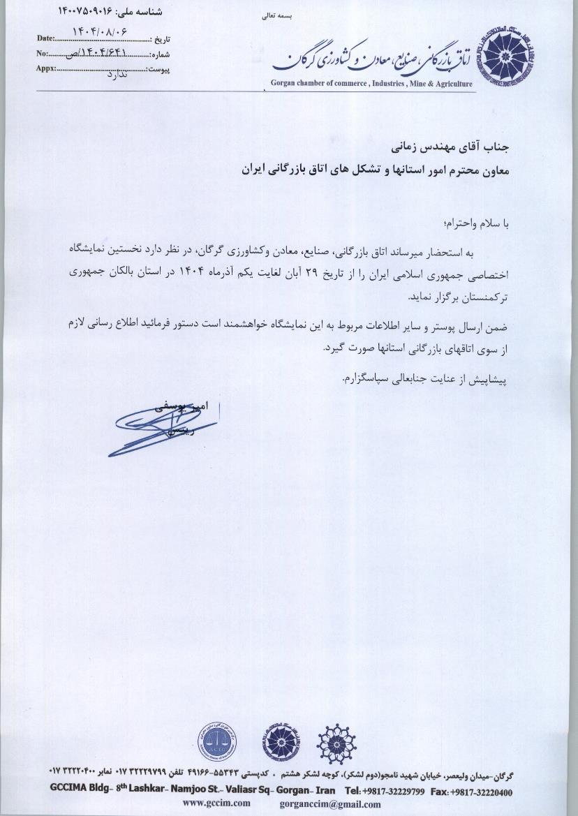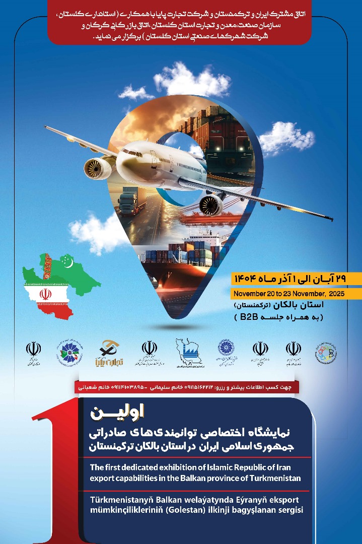 نمایشگاه تخصصی ظرفیتهای صادراتی استان گلستان در منطقه بالکانآباد ترکمنستان برگزار میشود. این نمایشگاه از تاریخ ۲۹ آبان ماه الی اول آذرماه 1404در استان بالکان جمهوری ترکمنستان برگزار میشود.