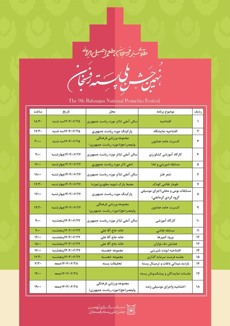 دبیر جشن ملی پسته نیز با اشاره به جزئیات برنامه ‌ها اظهار کرد: این جشن تنها یک مراسم اقتصادی نیست، بلکه فرصتی برای نشاط اجتماعی، معرفی ظرفیت‌های فرهنگی، علمی و تقویت همبستگی مردم رفسنجان است. سیدمصطفی مرتضوی، از برگزاری همایش ‌های تخصصی کشاورزی، نشست‌ های علمی، مسابقات شیرینی ‌پزی و غذای محلی، جشنواره عکس و موسیقی سنتی و برپایی نمایشگاه‌ های دستاوردها در نهمین جشن پسته رفسنجان خبر داد.