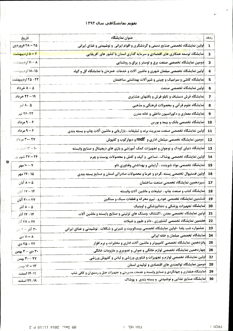بنا بر اعلام مدیرعامل شرکت نمایشگاه های جنوب شرق تقویم نمایشگاهی استان کرمان در سال 94
